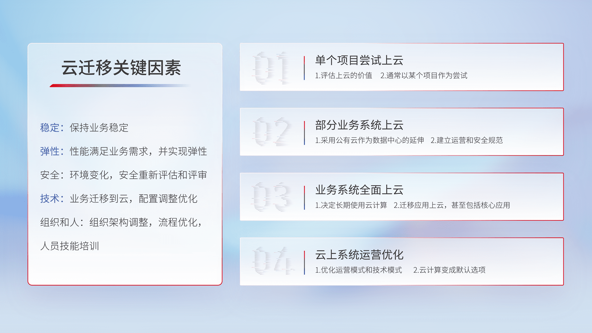 结合实际业务,,,,从规划设计、、云平台选型、、、云原生改造、、、、数据迁移、、集成交付,,,迁移全过程为客户识别最佳上云路径,,,,做好风险识别管理,,设计网络架构、、身份权限、、、安全审计合规、、操作审计、、日志审计、、、监控告警策略、、、、多站点容灾设计等,,,,对云上基础设施进行整体规划,,,,提升IT治理水平,,,以满足弹性、、、、高可用、、高性能的需求。。。